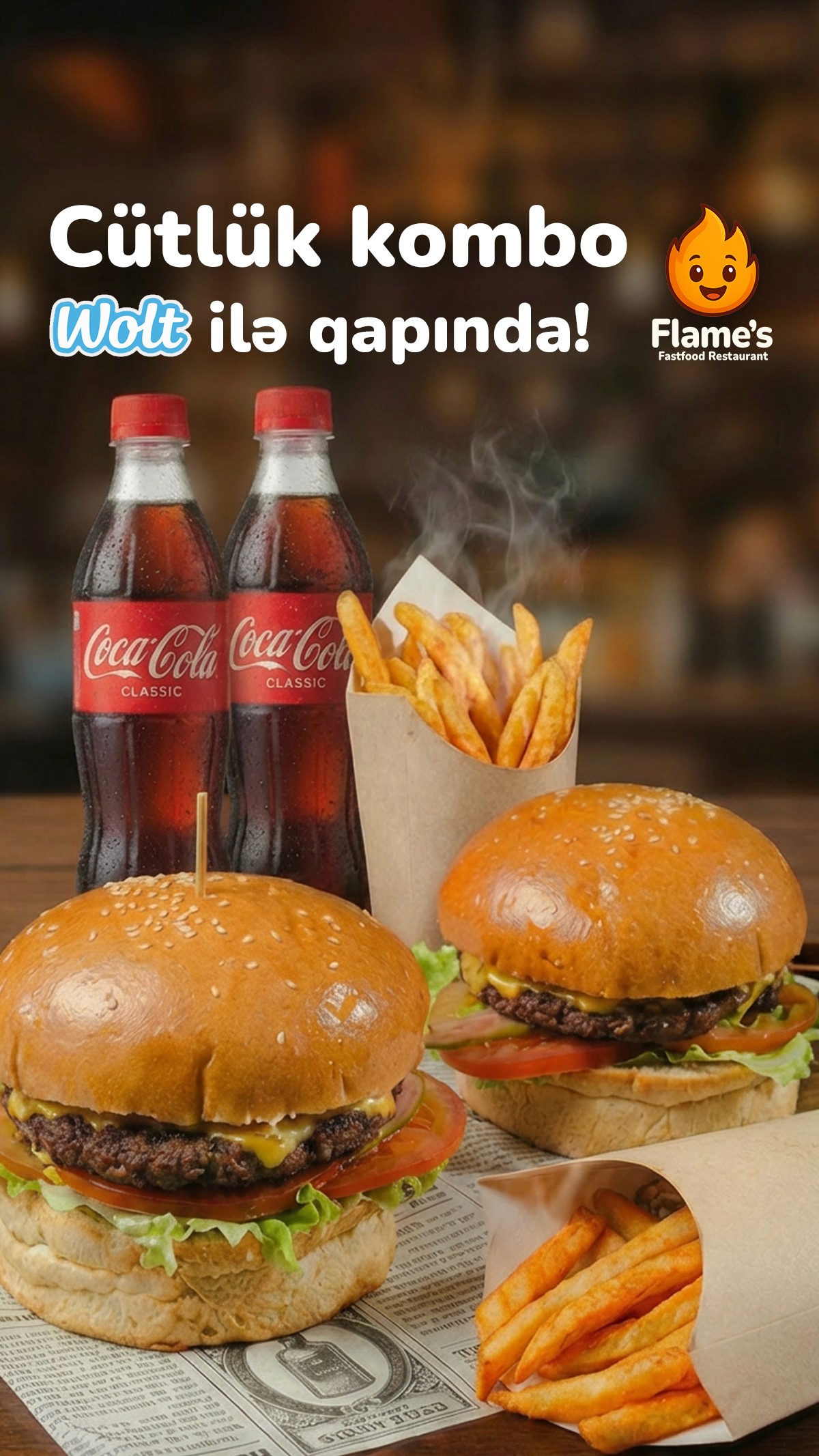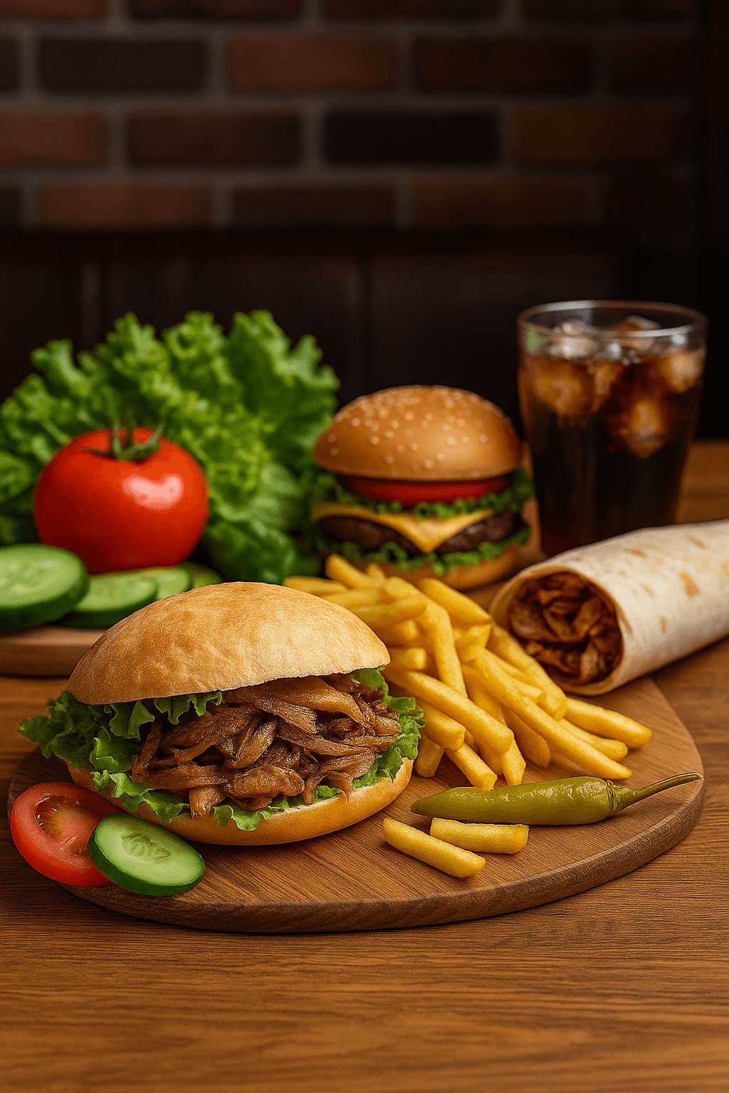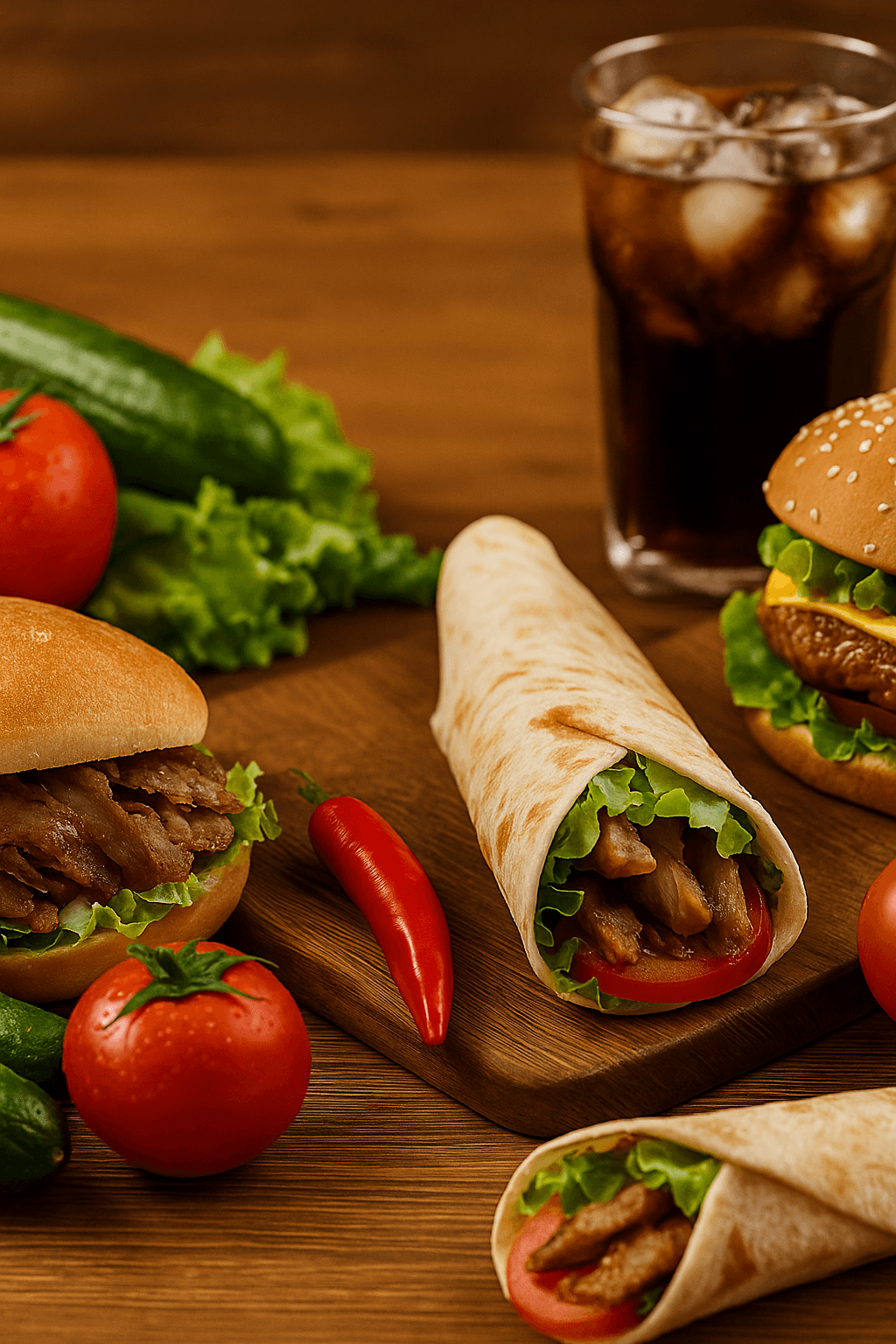 Burger, Dönər, Şaurma, Kartof fri, Toyuq qanadları, Toyuq nuggets, Toyuq strips, Səhər menyusu,